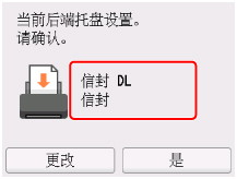 关闭进纸插槽盖板后,触摸屏上会显示后端托盘的纸张设置确认屏幕。