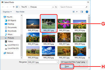Klik foto (G) yang ingin Anda cetak dan pilih Buka(Open) (H).