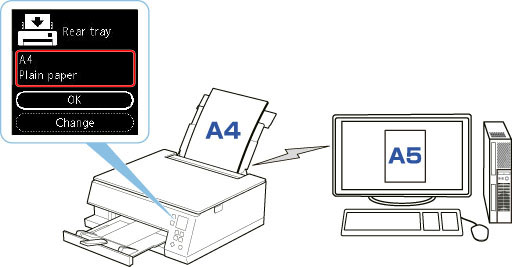 Näiteks kui printimise paberisuruuse määrang on A5 ja printeri jaoks registreeritud paberiteave on A4, laadige enne printimise alustamist tagumisele alusele või kassetti paberit suurusega A5.
