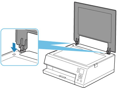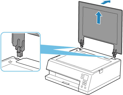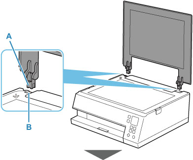 Sobitage dokumendikaane hinged (A) hoidikusse (B) ja sisestage mõlemad dokumendikaane hinged vertikaalselt, nagu näidatud alloleval joonisel.