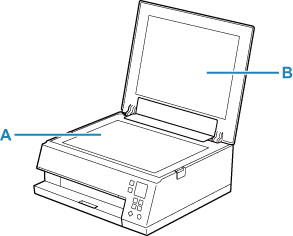 Kasutage pehmet, kuiva ja ebemevaba lappi. Pühkige õrnalt kopeerimisalust (A) ja dokumendikaane (valge leht) (B) sisemist külge. Pühkige ära kogu mustus, eriti klaaspinnalt.