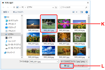 印刷する写真(K)をクリックし、[開く](L)を選ぶ