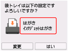 7. 表示された画面で、用紙サイズが[はがき]、用紙種類が[インクジェットはがき]であれば[はい]を選ぶ