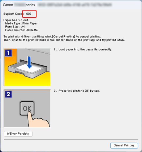 Když dojde k chybě při tisku, například pokud dojde nebo uvízne papír, zobrazí se automaticky zpráva o odstraňování problémů. U některých chyb se zobrazí také kód podpory (číslo chyby).