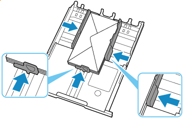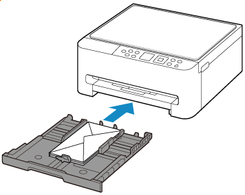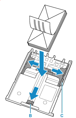 Vložte obálky orientované na výšku TISKOVOU STRANOU DOLŮ a umístěte je doprostřed kazety.