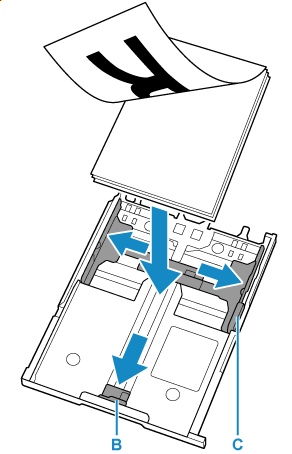 Posunutím vodítek papíru (B) vpředu a (C) vpravo otevřete vodítka papíru.