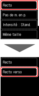 Appuyez sur le bouton OK de l'écran d'attente de copie pour afficher l'écran des paramètres d'impression, puis sélectionnez l'impression recto verso à partir de Autres.