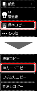 コピー待機画面でOKボタンを押して印刷設定画面を表示し、コピー機能で[IDカードコピー]を選びます。