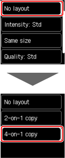 在影印待命螢幕上按OK按鈕以顯示列印設定螢幕,然後從其他(Others)選擇佈置為4合1影印(4-on-1 copy)。
