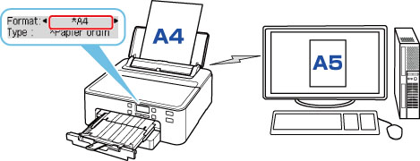 - Par exemple, si le paramètre de format de papier pour l'impression est A5 et que le format de papier enregistré dans l'imprimante est A4, l'imprimante démarre l'impression sur le papier chargé dans le réceptacle arrière ou dans la cassette sans modifier le paramètre de format du papier pour l'impression.
