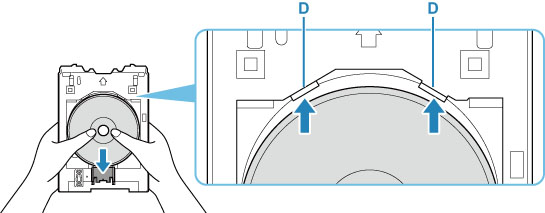Ao pressionar para baixo a trava com o disco imprimível, insira a parte superior do disco imprimível nos slits (D).