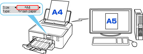 - Για παράδειγμα, όταν η ρύθμιση χαρτιού για την εκτύπωση είναι A5 και οι πληροφορίες χαρτιού που έχουν καταχωριστεί στον εκτυπωτή είναι A4, ο εκτυπωτής ξεκινά την εκτύπωση στο χαρτί που είναι τοποθετημένο στην πίσω θήκη ή στην κασέτα χωρίς να αλλάξετε τη ρύθμιση μεγέθους χαρτιού για την εκτύπωση.