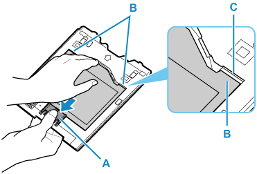 Medan du trycker ned låset (A) tar du bort två flikar (B) på ovansidan ur skårorna (C).