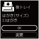 用紙のサイズや種類が異なるときは、[変更]を選び、用紙サイズで[はがき(サイズ)]、用紙種類で[IJはがき]を選びます。