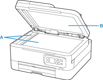 Χρησιμοποιήστε μαλακό, καθαρό και στεγνό πανί που δεν αφήνει χνούδι. Σκουπίστε απαλά τη γυάλινη επιφάνεια σάρωσης (A) και την εσωτερική πλευρά του καλύμματος εγγράφων (λευκό φύλλο) (B). Φροντίστε να μην αφήσετε υπολείμματα, ιδιαίτερα στη γυάλινη επιφάνεια.