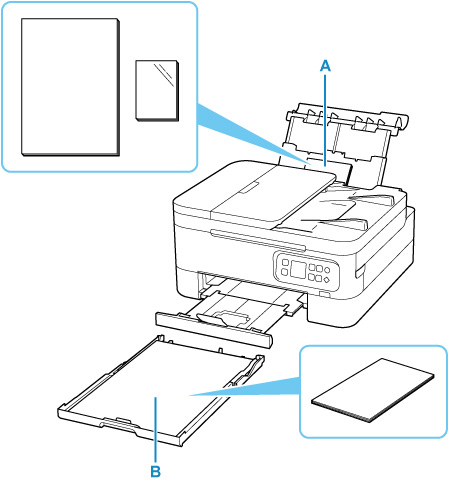 Printerim ir divi papīra avoti papīra padevei: aizmugures paliktnis (A) un kasete (B).