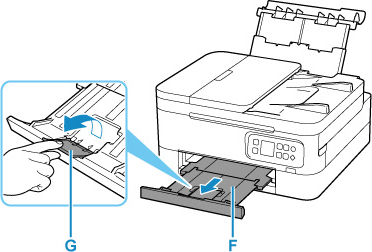 Izvelciet papīra izvades uztvērēju (F) un atveriet papīra izvades atbalstu (G).