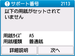用紙を交換した後、セットした用紙の設定を確認する画面が表示されます。セットした用紙に合わせて、設定を変更してください。