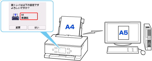 表示された用紙のサイズと種類が、後トレイにセットした用紙と同じであれば、[はい]を選びます。