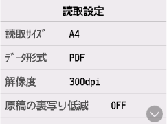スキャン待機画面で[読取設定]を選んで、設定項目を選びます。上下にフリックして設定項目を表示し、設定項目を選ぶと各設定が表示されます。設定を選んで指定します。