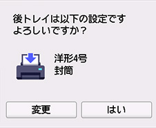 表示された用紙のサイズと種類が、後トレイにセットした封筒と同じであれば[はい]を選ぶ