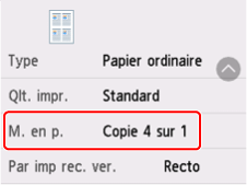 Sélectionnez Paramètres dans l'écran d'attente de copie pour afficher l'écran des paramètres d'impression. Sélectionnez Copie 4 sur 1 dans M. en p., puis sélectionnez OK.