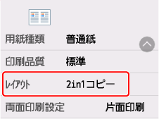 コピー待機画面で[印刷設定]を選んで印刷設定画面を表示し、[レイアウト]で[2in1コピー]を選んで、[OK]を選びます。