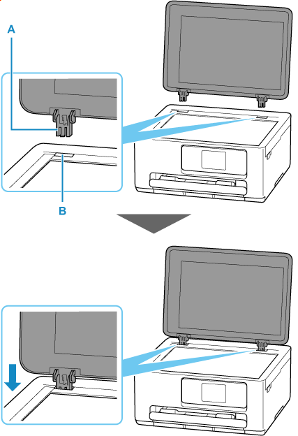 Belge kapağının her iki menteşesini (A) tutucuya (B) takın ve belge kapağının menteşelerini dikey şekilde yerleştirin.