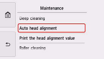 • Pokud chcete vytisknout a zkontrolovat aktuální hodnoty nastavení polohy tiskové hlavy, na obrazovce Údržba (Maintenance) vyberte možnost Tisk hodnoty nastavení hlavy (Print the head alignment value).