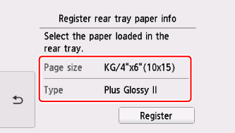 6. V nabídce Vel. str. (Page size)Typ (Type) vyberte velikost a typ vloženého papíru v zadní přihrádce a vyberte možnost Registrovat (Register).
