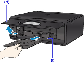 Όταν εμφανιστεί το μήνυμα που θα σας ζητά να τοποθετήσετε τον εκτυπώσιμο δίσκο, ανοίξτε τον πίνακα λειτουργίας (H) και κατόπιν, διαλέξτε τη θήκη δίσκου από τη θήκη αποθήκευσης δίσκου (I).