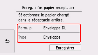 Sélectionnez la taille et le type des enveloppes chargées dans le réceptacle arrière dans Form. p. et Type, puis sélectionnez Enregistrer.