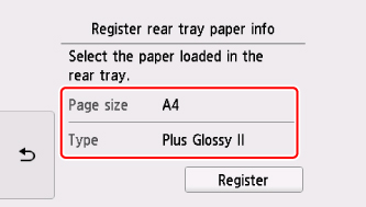 Selectaţi dimensiunea şi tipul hârtiei încărcate în tava din spate utilizând opţiunile Dim. pag. (Page size) şi Tip (Type), apoi selectaţi Înregistrare (Register).