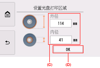 点击外径或内径(C),指定打印区域,然后点击OK(D)。