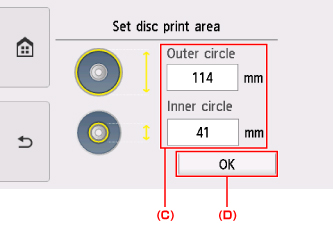 Ťuknite na položku Vonkajší kruh (Outer circle) alebo Vnútorný kruh (Inner circle) (C), zadajte oblasť tlače a ťuknite na tlačidlo OK (D).
