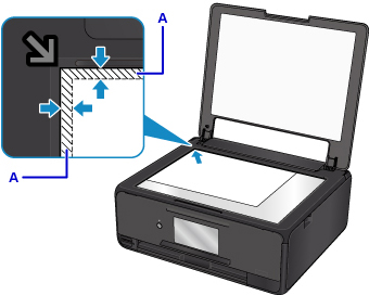 Printeren kan ikke scanne det skraverede område (A) (1 mm (0,04 tommer) fra kanterne af glaspladen).
