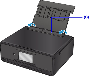Buka penutup tatakan belakang (A), kemudian tarik naik pendukung kertas (B).