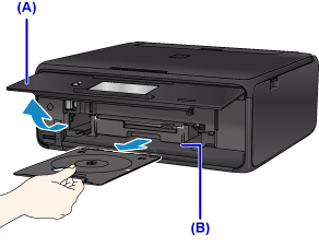 เมื่อข้อความที่บอกให้คุณใส่ดิสก์ที่พิมพ์ได้แสดงขึ้น เปิดแผงการทำงาน (A) จากนั้นให้เลือกดิสก์เทรย์จากที่เก็บดิสก์เทรย์ (B)