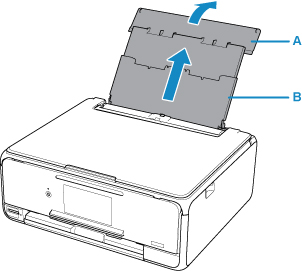 Ανοίξτε το κάλυμμα της πίσω θήκης (A) και, στη συνέχεια, τραβήξτε την υποστήριξη χαρτιού (B).