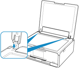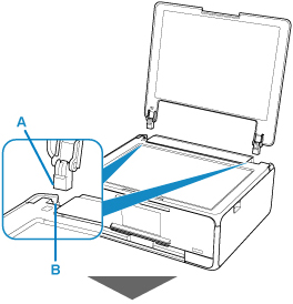 Προσαρμόστε και τα δύο άγκιστρα (A) του καλύμματος εγγράφων στην υποδοχή (B) και εισαγάγετε και τα δύο άγκιστρα του καλύμματος εγγράφων κατακόρυφα, όπως εικονίζεται παρακάτω.