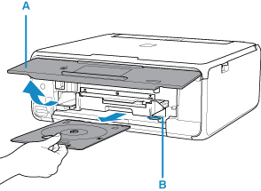 Kai bus pateiktas pranešimas, raginantis įdėti spausdinamąjį diską, atidarykite valdymo skydelį (A) ir disko dėklo laikymo skyriuje (B) pasirinkite disko dėklą.