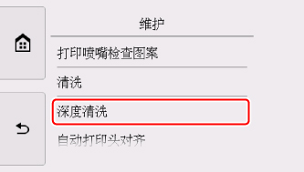 如果标准打印头清洗未改善打印质量,则深度清洗打印头。 深度清洗打印头比标准清洗打印头消耗更多墨水,因此请仅在必要时深度清洗打印头。