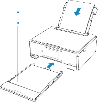 Ο εκτυπωτής διαθέτει δύο προελεύσεις για την τροφοδοσία χαρτιού, την πίσω θήκη (Α) και την κασέτα (Β).