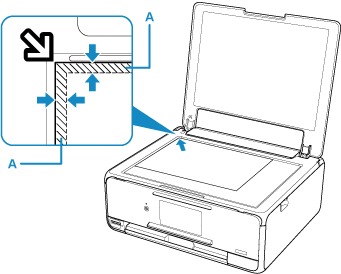 Spausdintuvas negali nuskaityti įstrižai subrūkšniuotos srities (A) (1 mm (0,04 col.) nuo ekspozicinio stiklo kraštų).