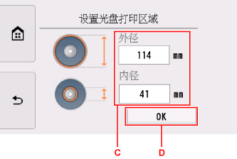 选择外径内径(C),指定打印区域,然后选择OK(D)。
