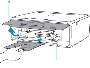 เมื่อมีข้อความขอให้คุณใส่ดิสก์ที่พิมพ์ได้แสดงขึ้น ให้เปิดแผงการทำงาน (H) จากนั้นดึงดิสก์เทรย์ออกมาจากที่เก็บดิสก์เทรย์ (I)