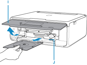 Khi thông báo yêu cầu bạn nạp đĩa có thể in hiển thị, mở bảng thao tác (I), rồi lấy khay đĩa ra từ ngăn lưu giữ khay đĩa (J).