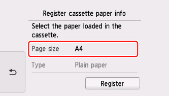 Chọn kích cỡ và loại giấy được nạp trong cát-xét tại Cỡ trang(Page size), rồi chọn Đăng ký(Register).
