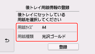 後トレイにセットした用紙に合わせて[用紙サイズ]と[用紙種類]を設定し、[登録]を選ぶ