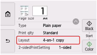 Näytä tulostusasetusten näyttö valitsemalla kopioinnin valmiusnäytössä Asetukset (Settings), valitse Asettelu (Layout)-kohdassa 4-on-1-kopiointi (4-on-1 copy) ja valitse sitten OK.